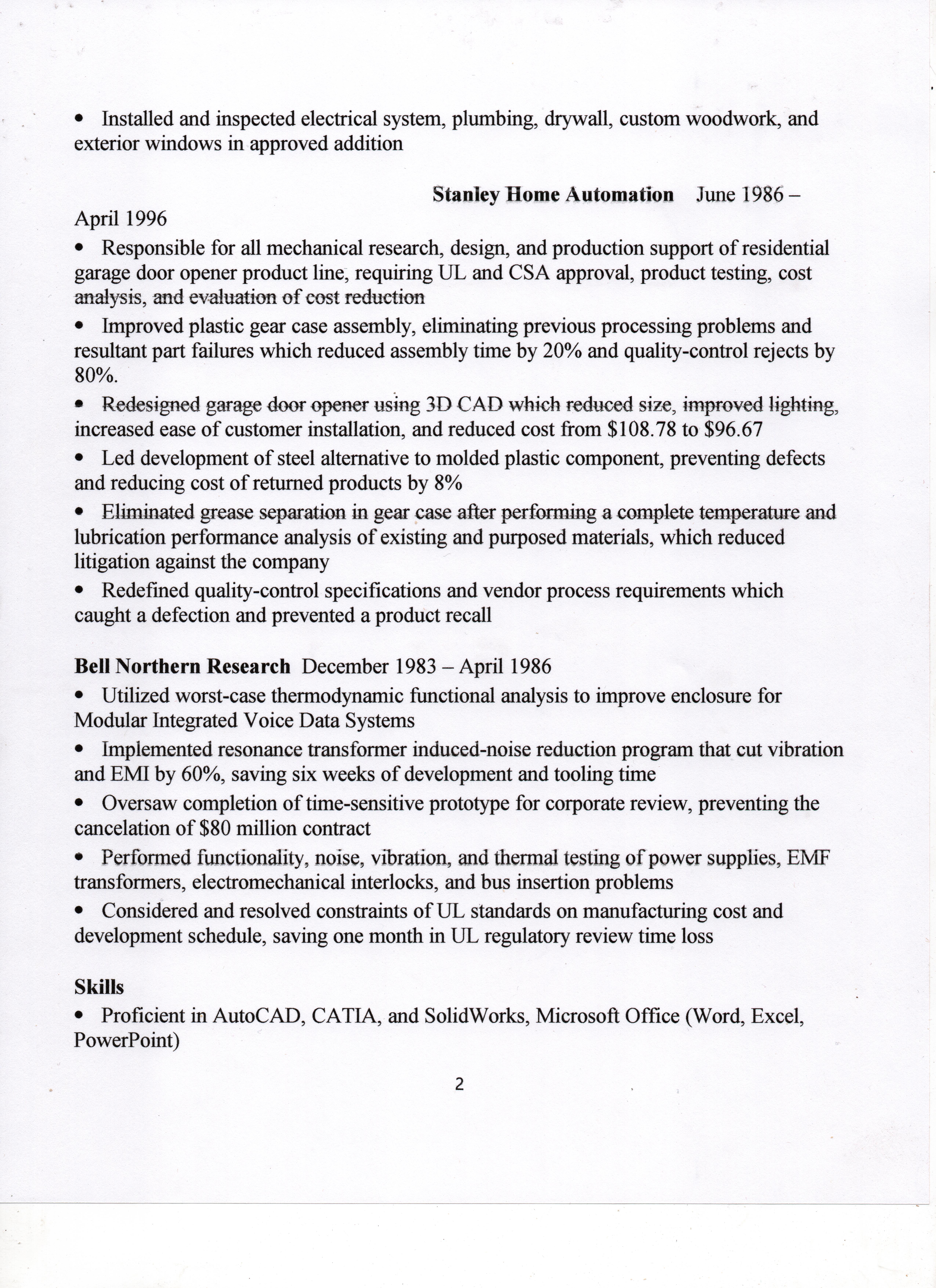 ⦁ Coordinated production timelines and shipping to clients, considering financial implications and competitor’s decisions ⦁ Facilitated communication, acting as a liaison between management and employees RPS Enterprises April 1996 – June 2012 ⦁ Started and ran prototype development business specializing in small-scale industrial contracts ⦁ Developed unique linear actuator for robotic arms and legs and formulated spur gear design and manufacturing program that computes 35 related solutions using 3 input variables, which sped up the gear set manufacture process by 20% ⦁ Using client specifications, designed and machined store display cases and LED housing assembles at 33% of competitor cost ⦁ Drew architectural plans for residential addition, which was approved by Livonia City ⦁ Installed and inspected electrical system, plumbing, drywall, custom woodwork, and exterior windows in approved addition Stanley Home Automation June 1986 – April 1996 ⦁ Responsible for all mechanical research, design, and production support of residential garage door opener product line, requiring UL and CSA approval, product testing, cost analysis, and evaluation of cost reduction ⦁ Improved plastic gear case assembly, eliminating previous processing problems and resultant part failures which reduced assembly time by 20% and quality-control rejects by 80%. ⦁ Redesigned garage door opener using 3D CAD which reduced size, improved lighting, increased ease of customer installation, and reduced cost from $108.78 to $96.67 ⦁ Led development of steel alternative to molded plastic component, preventing defects and reducing cost of returned products by 8% ⦁ Eliminated grease separation in gear case after performing a complete temperature and lubrication performance analysis of existing and purposed materials, which reduced litigation against the company ⦁ Redefined quality-control specifications and vendor process requirements which caught a defection and prevented a product recall Bell Northern Research December 1983 – April 1986 ⦁ Utilized worst-case thermodynamic functional analysis to improve enclosure for Modular Integrated Voice Data Systems ⦁ Implemented resonance transformer induced-noise reduction program that cut vibration and EMI by 60%, saving six weeks of development and tooling time ⦁ Oversaw completion of time-sensitive prototype for corporate review, preventing the cancelation of $80 million contract ⦁ Performed functionality, noise, vibration, and thermal testing of power supplies, EMF transformers, electromechanical interlocks, and bus insertion problems ⦁ Considered and resolved constraints of UL standards on manufacturing cost and development schedule, saving one month in UL regulatory review time loss Skills ⦁ Proficient in AutoCAD, CATIA, and SolidWorks, Microsoft Office (Word, Excel, PowerPoint) ⦁ Cost analysis and reduction, product testing, quality control, and root-cause analysis ⦁ Product fabrication, machining, shop manufacturing, and prototype development Other Interests ⦁ High school athletics, son’s soccer games and piano recitals
