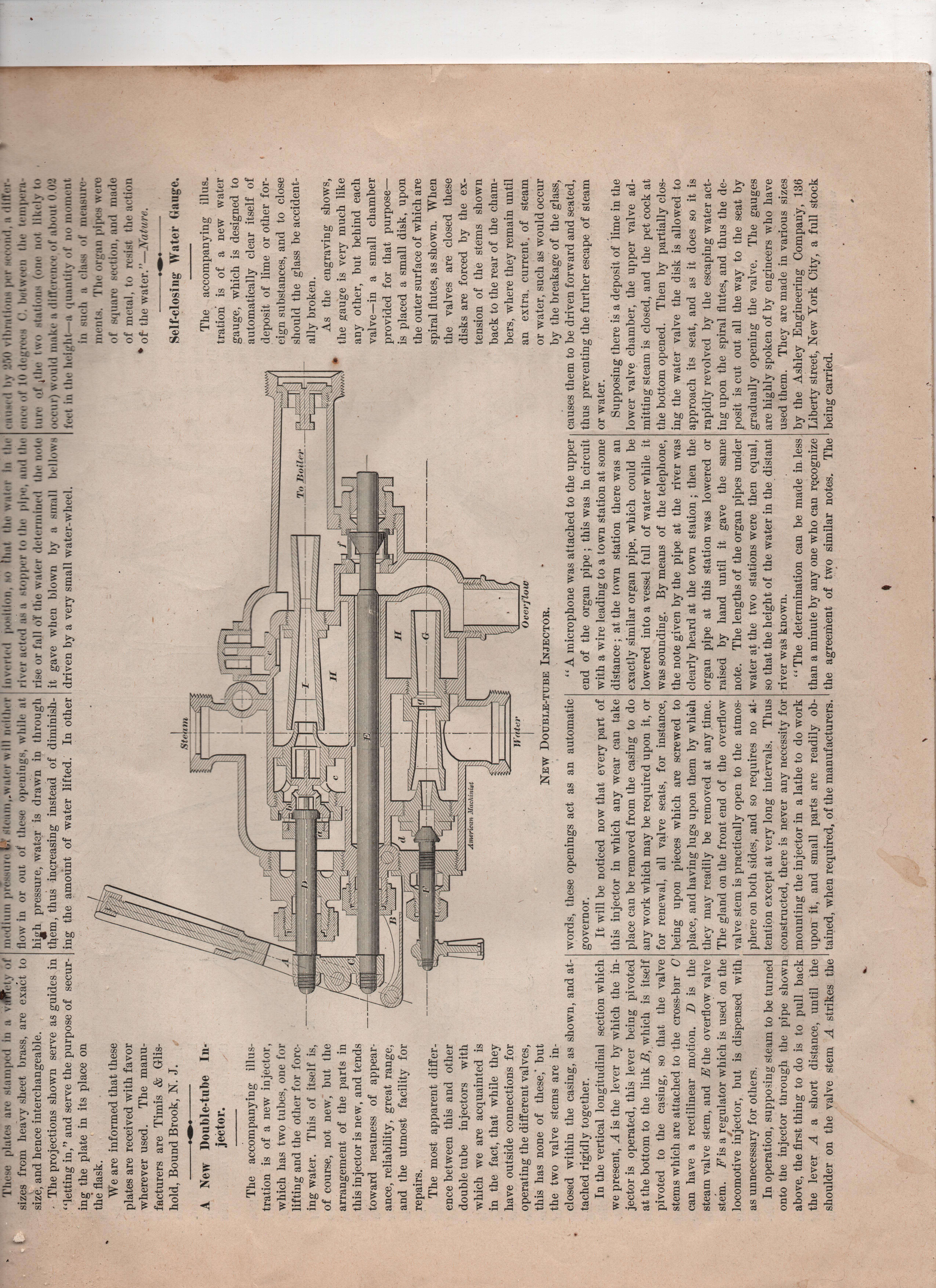 The accompanying illus-tration is of a new injector, which has two tubes, one for lifting and the other for forc-ing water. This of itself is, of course, not new, but the arrangement of the parts in this injector is new, and tends toward neatness of appear-ance, reliability, great range, and the utmost facility for repairs. The most apparent differ-ence between this and other double tube injectors with which we are acquainted is in the fact, that while they have outside connections for operating the different valves, this has none of these; but the two valve stems are in-closed within the casing, as shown, and at-tached rigidly together. In the vertical longitudinal section which we present, A is the lever by which the in-jector is operated, this lever being pivoted at the bottom to the link B, which is itself pivoted to the casing, so that the valve stems which are attached to the cross-bar C can have a rectilinear motion. D is the steam valve stem, and E the overflow valve stem. F is a regulator which is used on the locomotive injector, but is dispensed with as unnecessary for others. In operation, supposing steam to be turned onto the injector through the pipe shown above, the first thing to do is to pull back the lever A a short distance, until the shoulder on the valve stem A strikes the