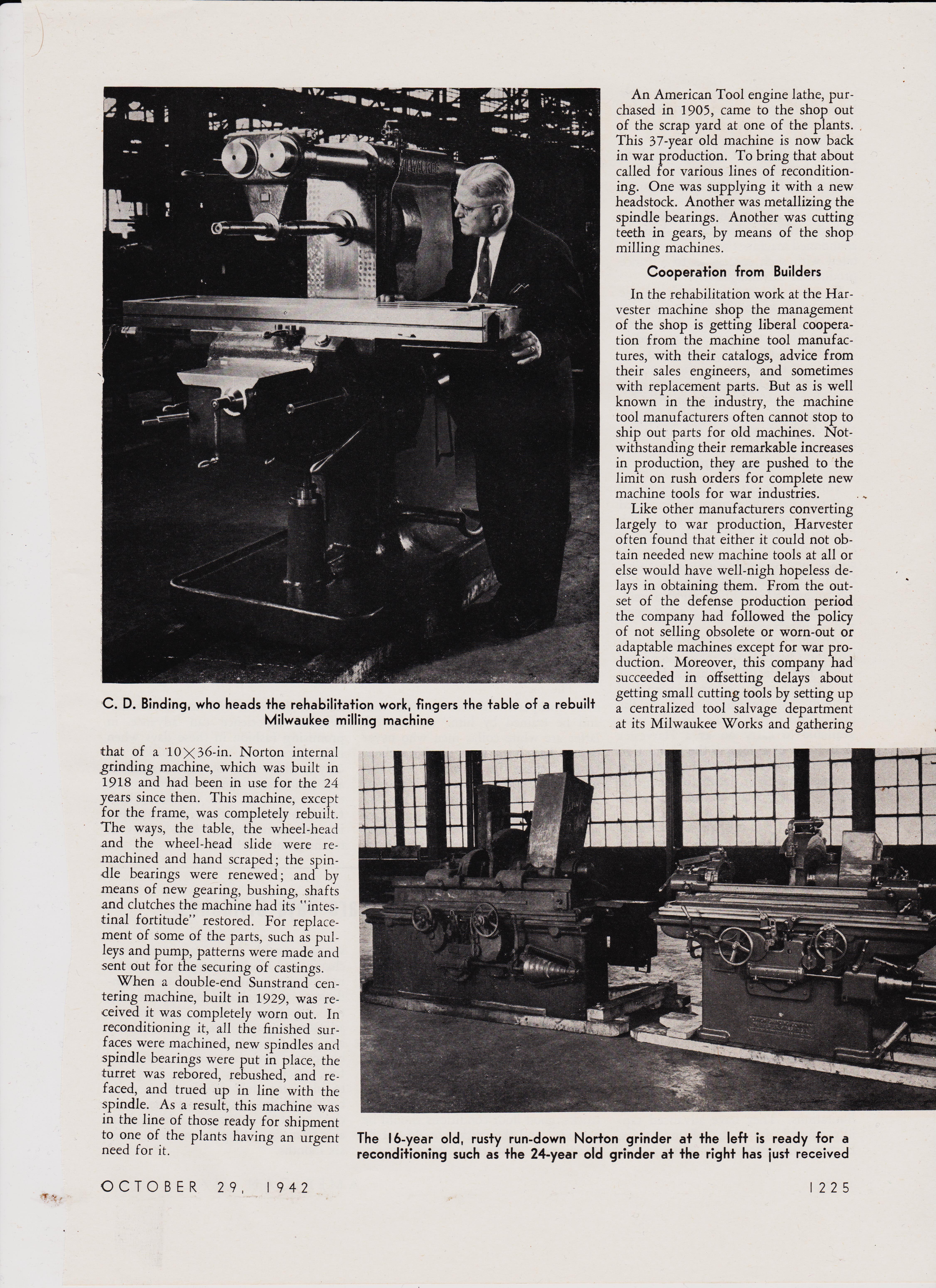 This 37-year old machine is now back in war production. To bring that about called for various lines of recondition-ing. One was supplying it with a new headstock. Another was metallizing the spindle bearings. Another was cutting teeth in gears, by means of the shop milling machines. Cooperation from Builders In the rehabilitation work at the Har-vester machine shop the management of the shop is getting liberal coopera-tion from the machine tool manufactures, with their catalogs, advice from their sales engineers, and sometimes with replacement parts. But as is well known in the industry, the machine tool manufacturers often cannot stop to ship out parts for old machines. Not-withstanding their remarkable increases in production, they are pushed to the limit on rush orders for complete new machine tools for war industries. Like other manufacturers converting largely to war production, Harvester often found that either it could not ob-tain needed new machine tools at all or else would have well-nigh hopeless de-lays in obtaining them. From the out-set of the defense production period the company had followed the policy of not selling obsolete or worn-out or adaptable machines except for war pro-duction. Moreover, this company had succeeded in offsetting delays about getting small cutting tools by setting up a centralized tool salvage department at its Milwaukee Works and gathering