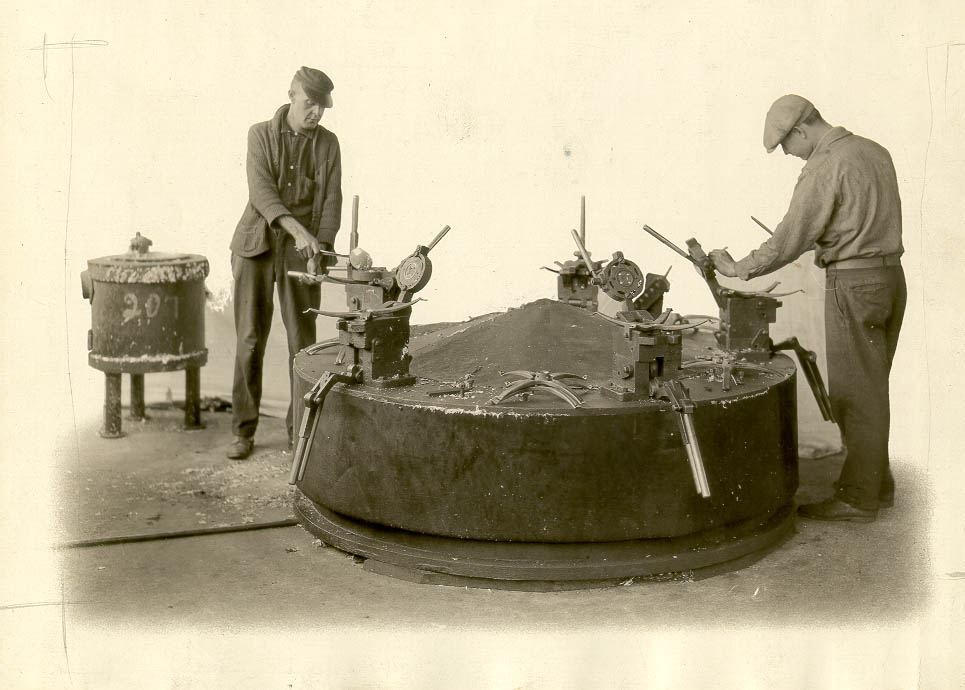 Above Producing steering wheel spiders for Willys-Overland, c. 1913