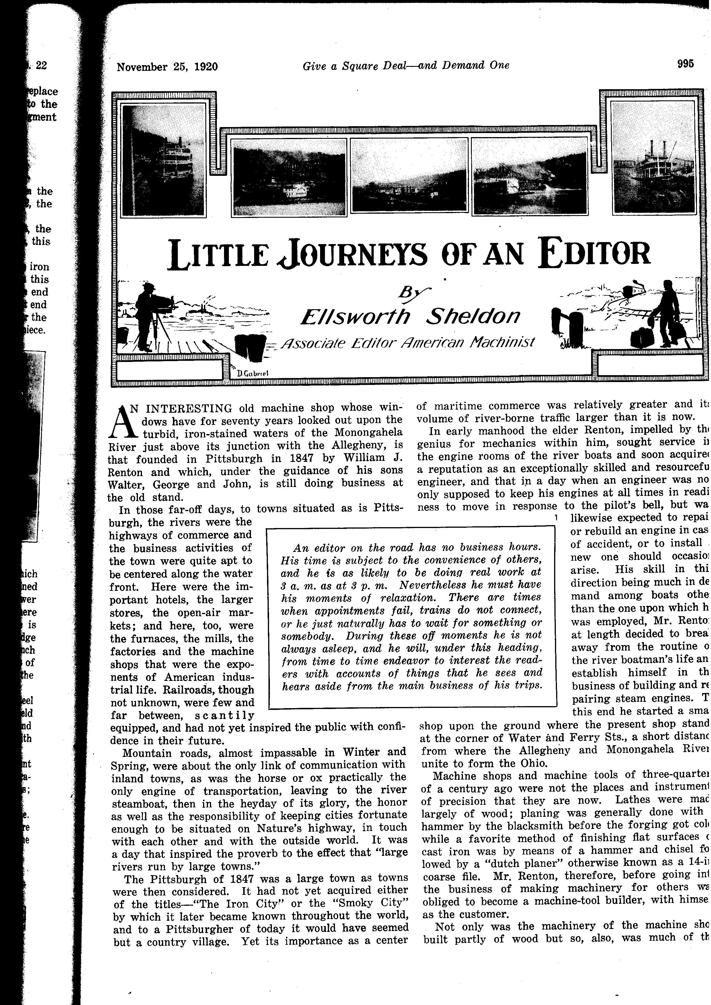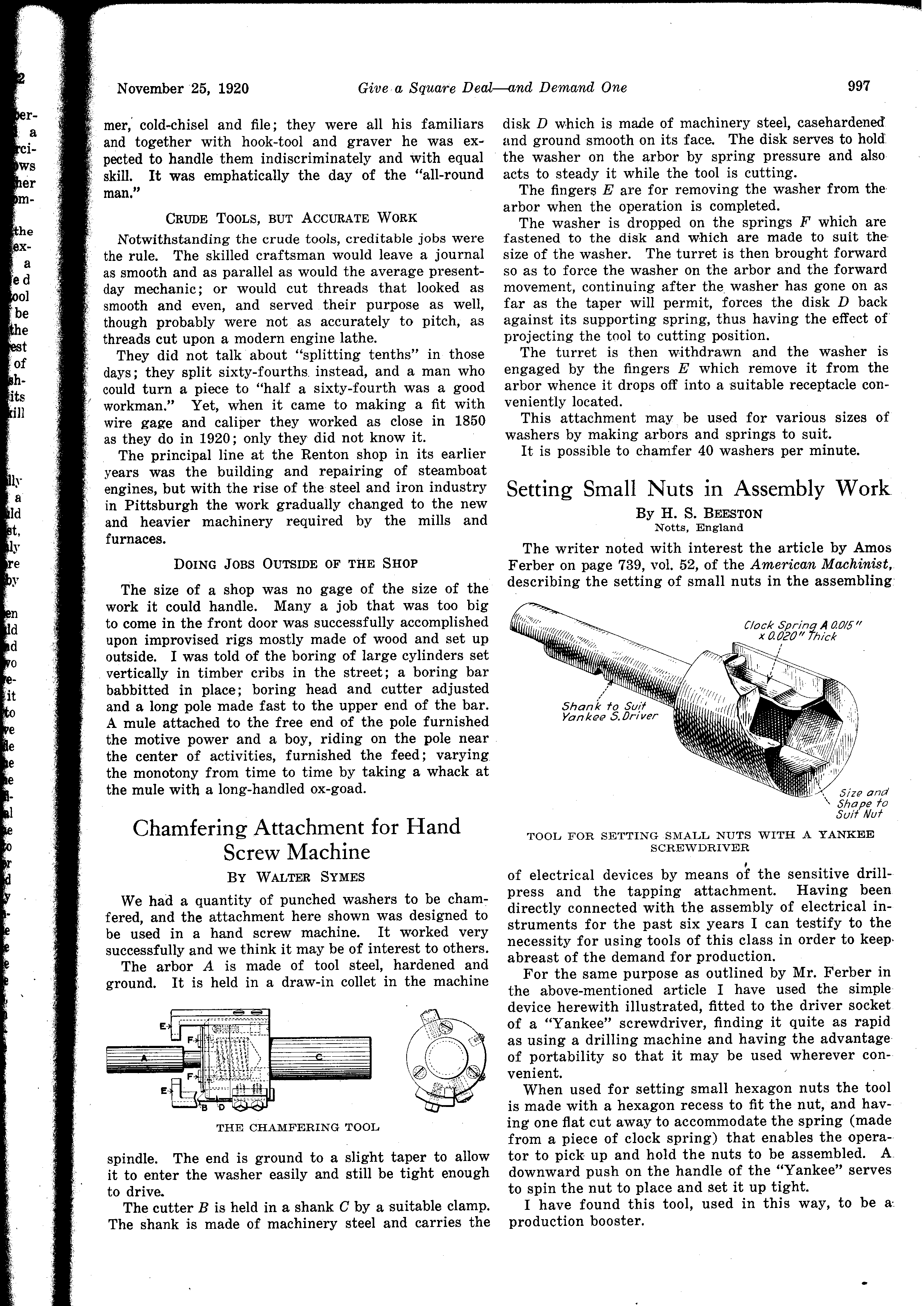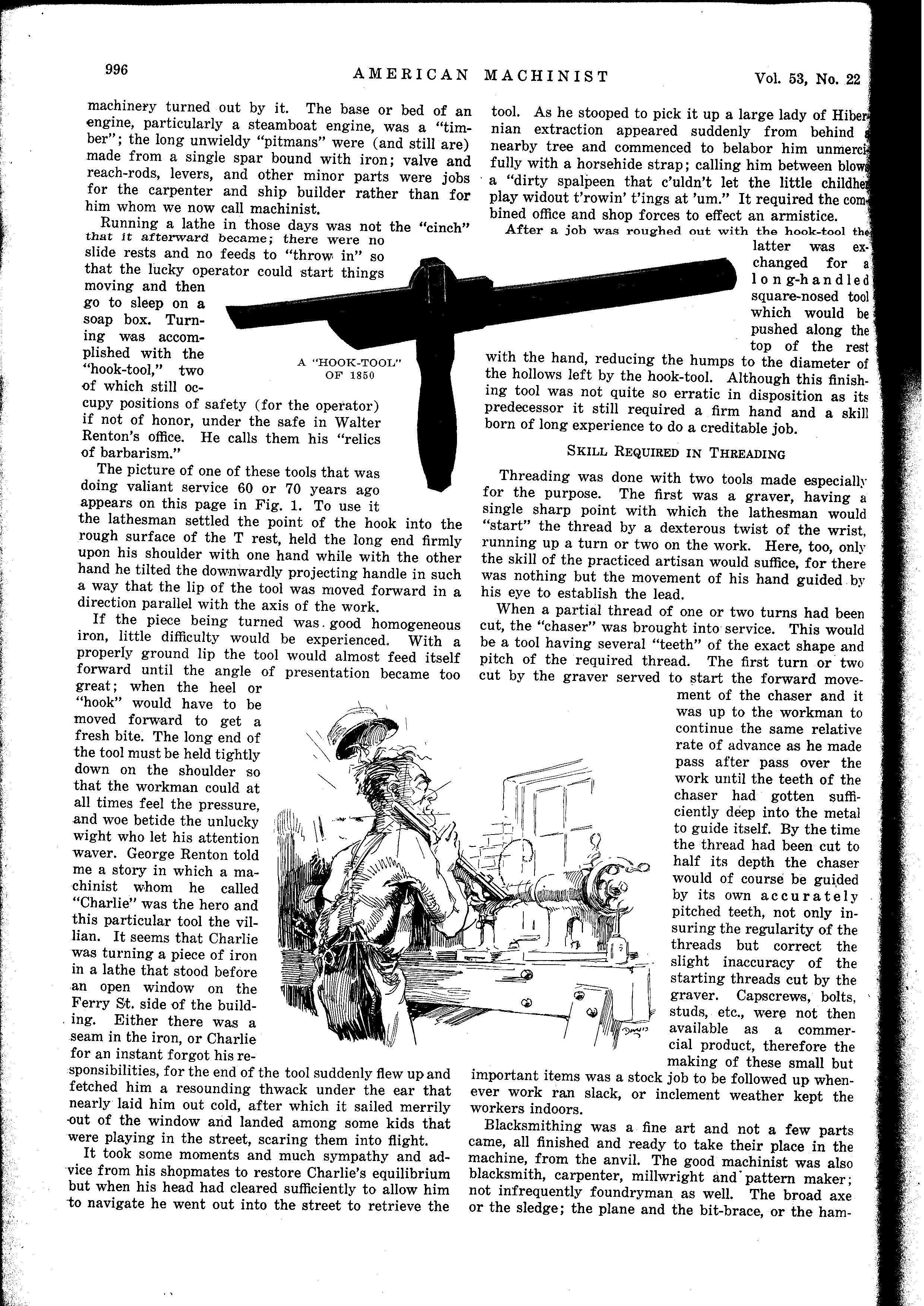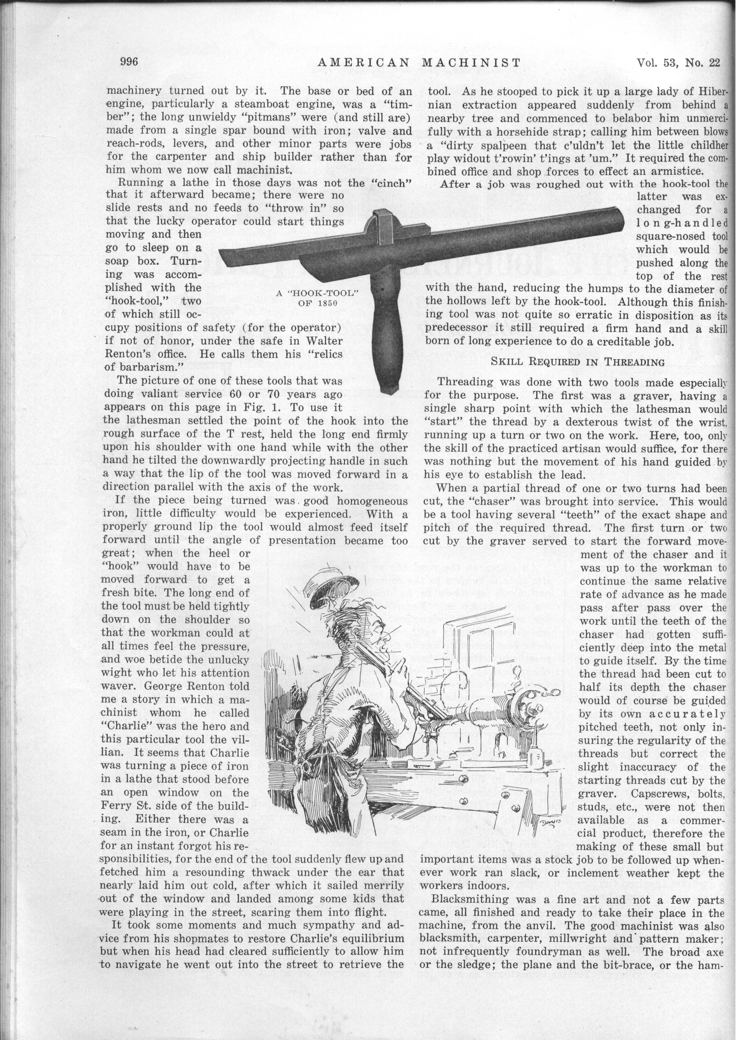 | A ‘HOOK-TOOL” (handheld) OF 1850 SKILL REQUIRED IN THREADING 1896 AMERICAN MACHINIST The base or bed of an engine, particularly a steamboat engine, was a “timber”; the long unwieldy “pitmans” were (and still are) made from a single spar bound with iron; valve and reach-rods,levers, and other minor parts were jobs for the carpenter and ship builder rather than for him whom we now call machinist. Running a lathe in those days was not the “cinch” that it afterward became; there were no slide rests and no feeds to “throw in” so that the lucky operator could start things moving and then go to sleep on a soap box. Turn- ing was accomplished with the “hook-tool,” two of which still occupy positions of safety (for the operator) if not of honor, under the safe in Walter Renton’s office. He calls them his “relics of barbarism.” The picture of one of these tools that was doing valiant service 60 or 70 years ago appears on this page in Fig. 1. To use it the lathesman settled the point of the hook into the rough surface of the T rest, held the long end firmly upon his shoulder with one hand while with the other hand he tilted the downwardly projecting handle in such a way that the lip of the tool was moved forward in a direction parallel with the axis of the work. If the piece being turned was. good homogeneous iron, little difficulty would be experienced, With a properly ground lip the tool would almost feed itself forward until the angle of presentation became too great; when the heel or “hook” would have to be moved forward to get a fresh bite. The long end of the tool must be held tightly down on the shoulder so that the workman could at all times feel the pressure, and woe betide the unlucky wight who let his attention waver. George Renton told me a story in which a ma- chinist whom he called “Charlie” was the hero and this particular tool the vil- han. It seems that Charlie was turning a piece of iron in a lathe that stood before an open window on the Ferry St. side of the build- ing. Either there was a seam in the iron, or Charlie for an instant forgot his re- sponsibilities, for the end of the tool suddenly flew up and fetched him a resounding thwack under the ear that nearly laid him out cold, after which it sailed merrily ‘out of the window and landed among some kids that were playing in the street, scaring them into flight. It took some moments and much sympathy and ad- vice from his shopmates to restore Charlie’s equilibrium but when his head had cleared sufficiently to allow him -to navigate he went out into the street to retrieve the Vol. 53, No. 22 1 tool. As he stooped to pick it up a large lady of Hibes nian extraction appeared suddenly from behind nearby tree and commenced to belabor him unmerc fully with a horsehide strap; calling him between b~ a “dirty spaljeen that c’uldn’t let the little chil play widout t’rowin’ t’ings at ‘um.” It required the corn, bined office and shop forces to effect an armistice. After a job was roughed out with the hook-tool th~ latter was ex.i changed for a 1 o n g-h an d led square-nosed tool which would be pushed along the top of the rest with the hand, reducing the humps to the diameter of the hollows left by the hook-tool. Although this finish- ing tool was not quite so erratic in disposition as its predecessor it still required a firm hand and a skill born of long experience to do a creditable job. Threading was done with two tools made especially for the purpose. The first was a graver, having a single sharp point with which the lathesman would “start” the thread by a dexterous twist of the wrist, running up a turn or two on the work. Here, too, only the skill of the practiced artisan would suffice, for there was nothing but the movement of his hand guided by his eye to establish the lead. When a partial thread of one or two turns had been cut, the “chaser” was brought into’ service. This would be a tool having several “teeth” of the exact shape and pitch of the required thread. The first turn or two cut by the graver served to start the forward move- ment of the chaser and it was up to the workman to continue the same relative rate of advance as he made pass after pass over the work until the teeth of the chaser had gotten suffi- ciently deep into the metal to guide itself. By the time the thread had been cut to half its depth the chaser would of course be guided by its own accurately pitched teeth, not only in- suring the regularity of the threads but correct the slight inaccuracy of the starting threads cut by the graver. Capscrews, bolts, studs, etc., were not then available as a commer- cial product, therefore the making of these small but important items was a stock job to be followed up when- ever work ran slack, or inclement weather kept the workers indoors. Blacksmithing was a fine art and not a few parts came, all finished and ready to take their place in the machine, from the anvil. The good machinist was also blacksmith, carpenter, millwright andY pattern maker; not infrequently foundryman as well. The broad axe or the sledge; the plane and the bit-brace, or the ham- |